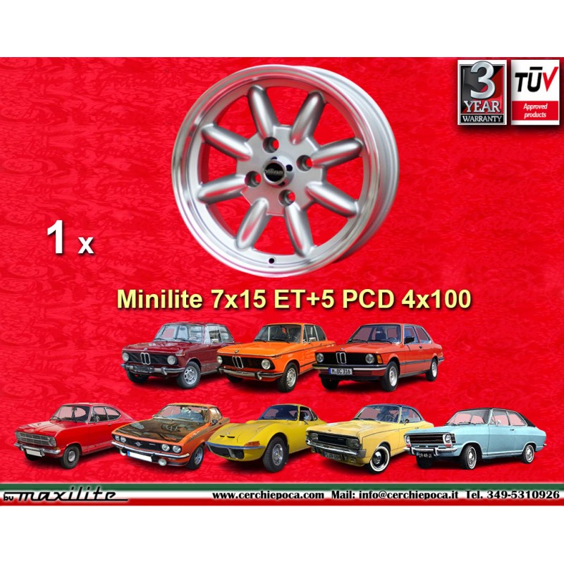Design Minilite in silver/diamond cut Finish Abmessungen 7x15 Lochkreis PCD 4x100 offset ET5 Zentrallochdurchmesser 57.1 mm Einzelfelgengewicht Kg 6.7. Hersteller: Maxilite. Herstellergarantie 3 Jahre. Homologationszertifikate: TUV. Ruckgabe und Ruckerstattung fur unbenutzte Produkte ohne Gebrauchsspuren in der Originalverpackung gemaß den gesetzlichen Bestimmungen moglich.