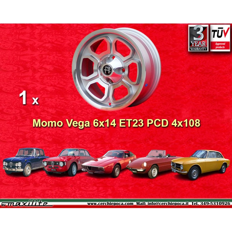 Design Vega silver/diamond cut finish size 6x14 PCD 4x108 offset ET23 center bore 70.1 mm weight Kg 5.9. Producer: Maxilite. Warranty 3 years by manufacturer. Certificates of homologation: TUV. Possible return and refund for unused products without signs of use, in the original packaging, according to the terms of the law.