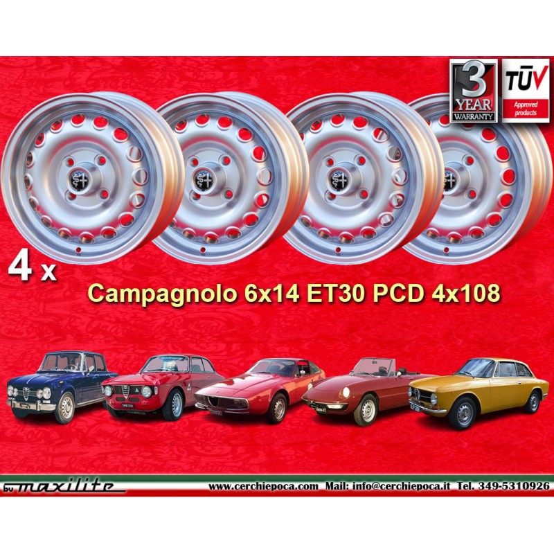 Design Campagnolo silver finish size 6x14 PCD 4x108 offset ET30 center bore 70.1 mm weight Kg 5.9. Producer: Maxilite. Warranty 3 years by manufacturer. Certificates of homologation: TUV. Possible return and refund for unused products without signs of use, in the original packaging, according to the terms of the law.