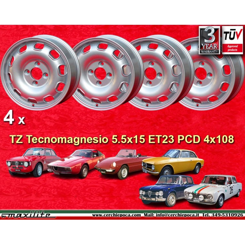 Design TZ silver finish size 5.5x15 PCD 4x108 offset ET35 center bore 70.1 mm weight Kg 6.7. Producer: Maxilite. Warranty 3 years by manufacturer. TUV certification available (parts certificate). Available also the Swiss certification. Possible return and refund for unused products without signs of use, in the original packaging, according to the terms of the law.