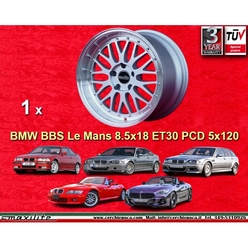 Design BBS Le Mans silver/diamond cut lip finish size 8.5x18 PCD 5x120 offset ET30 center bore 72.6 mm weight Kg 11.2. Producer: Maxilite. Warranty 3 years by manufacturer. Certificates of homologation: TUV. Possible return and refund for unused products without signs of use, in the original packaging, according to the terms of the law.