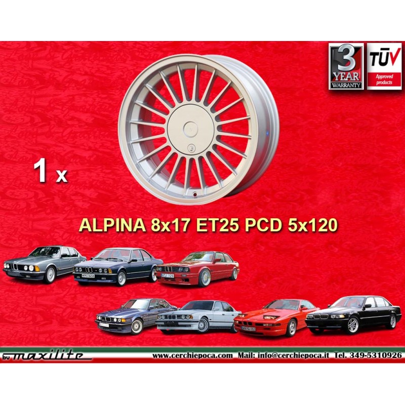 Design Alpina silver/black finish size 8x17 PCD 5x120 offset ET25 center bore 72.6 mm weight Kg 9.8. Producer: Maxilite. Warranty 3 years by manufacturer. Certificates of homologation: TUV. Possible return and refund for unused products without signs of use, in the original packaging, according to the terms of the law.