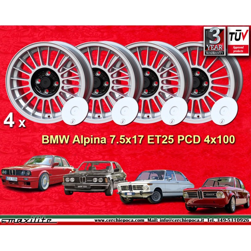 Design Alpina silver finish size 7.5x17 PCD 4x100 offset ET25 center bore 57.1 mm weight Kg 9.3. Producer: Maxilite. Warranty 3 years by manufacturer. Certificates of homologation: TUV. Possible return and refund for unused products without signs of use, in the original packaging, according to the terms of the law.