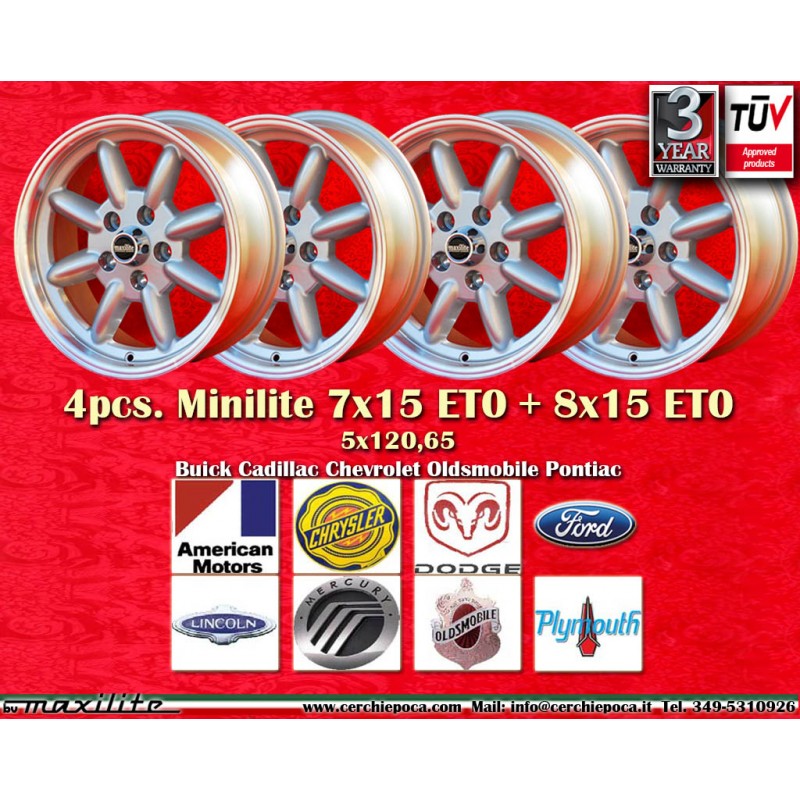 Design Minilite finish: silver/diamond cut. Sizes: 2 wheels 7x15 offset ET0 weight Kg 7.4 + 2 wheels 8x15 offset ET0 weight Kg 9 with PCD 5x120.65 center bore: 83.1 mm. Suitable for: Camaro Nova Chevelle El Camino BelAir Caprice Impala Corvette Produced by: Maxilite. Certificates of homologation: YES. Warranty 3 years by manufacturer. Possible return and refund for unused products without signs of use, in the original packaging, according to the terms of the law.