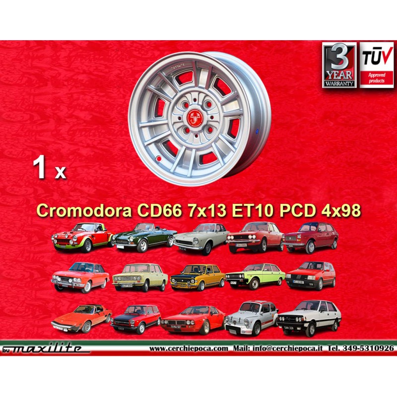 Design Cromodora CD66 silver finish size 7x13 PCD 4x98 offset ET10 center bore 58.6 mm weight Kg 7.4. Producer: Maxilite. Warranty 3 years by manufacturer. Certificates of homologation: TUV. Possible return and refund for unused products without signs of use, in the original packaging, according to the terms of the law.