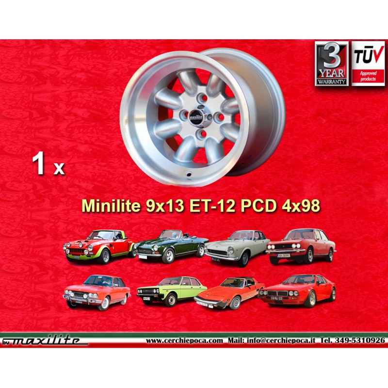 Design Minilite silver/diamond cut finish size 9x13 PCD 4x98 offset ET-12 center bore 58.6 mm weight Kg 7.5. Producer: Maxilite. Warranty 3 years by manufacturer. Certificates of homologation: TUV. Possible return and refund for unused products without signs of use, in the original packaging, according to the terms of the law.