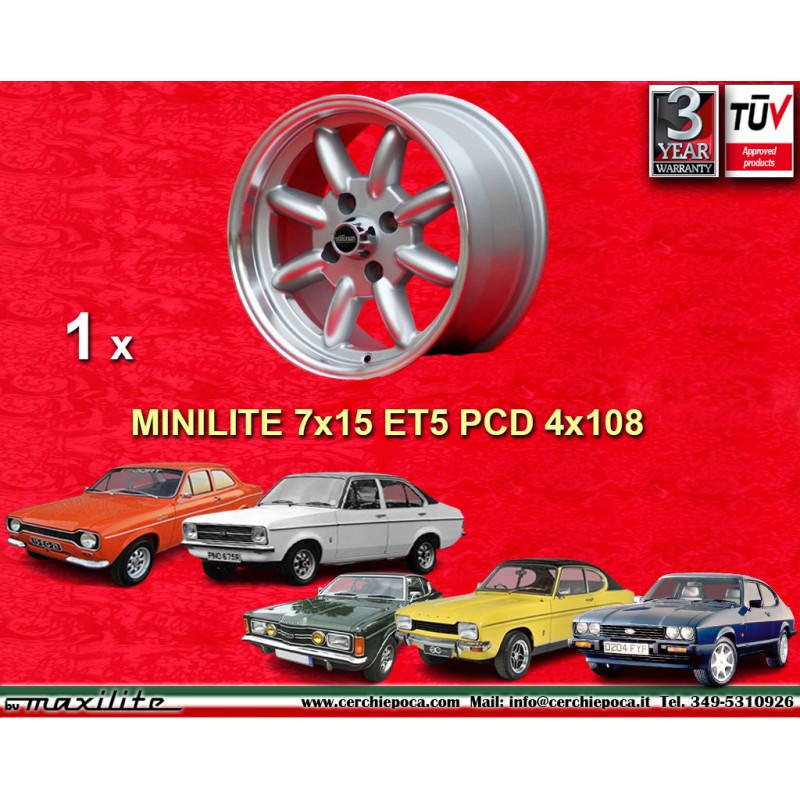 Design Minilite silver/diamond cut finish size 7x15 PCD 4x108 offset ET5 center bore 63.4 mm weight Kg 6.7. Producer: Maxilite. Warranty 3 years by manufacturer. Certificates of homologation: TUV. Possible return and refund for unused products without signs of use, in the original packaging, according to the terms of the law.