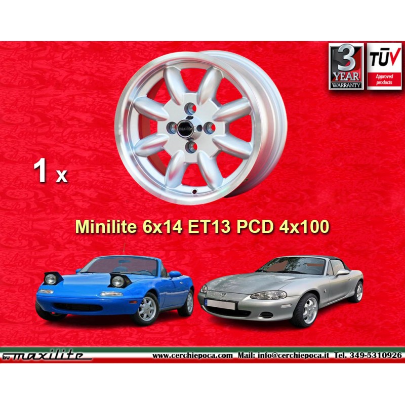 Design Minilite silver/diamond cut finish size 6x14 PCD 4x100 offset ET13 center bore 57.1 mm weight Kg 6.7. Producer: Maxilite. Warranty 3 years by manufacturer. Certificates of homologation: TUV. Possible return and refund for unused products without signs of use, in the original packaging, according to the terms of the law.