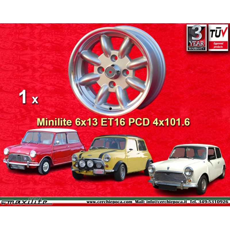 Design Minilite silver/diamond cut finish size 6x13 PCD 4x101.6 offset ET16 center bore 65.1 mm weight Kg 5.3. Producer: Maxilite. Warranty 3 years by manufacturer. Certificates of homologation: TUV. Possible return and refund for unused products without signs of use, in the original packaging, according to the terms of the law.
