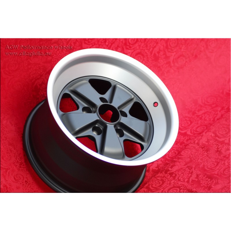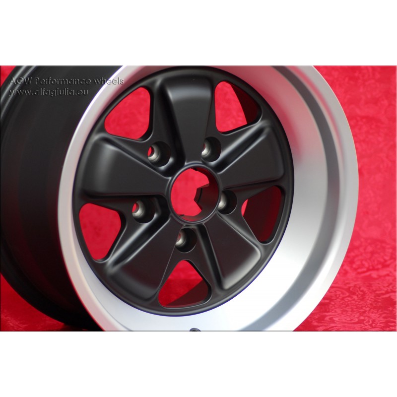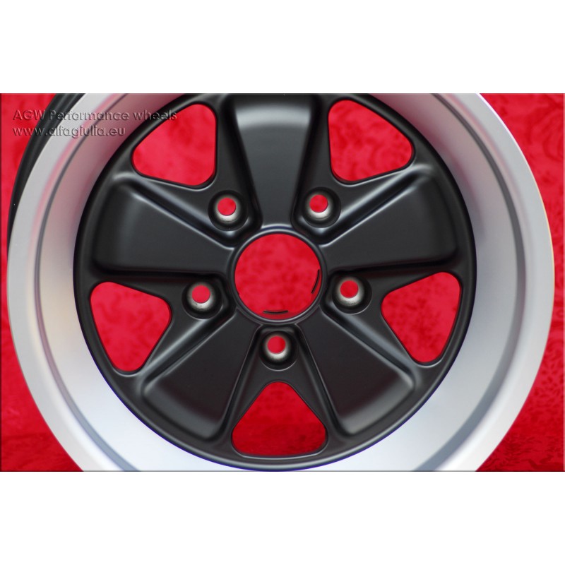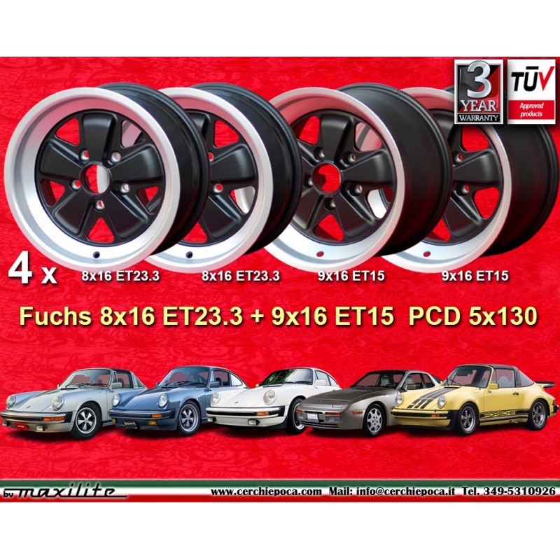 Design Fuchs finish: matt black/diamond cut. Sizes: 2 wheels 8x16 offset ET23.3 weight Kg 7.9 + 2 wheels 9x16 offset ET15 weight Kg 8.3 with PCD 5x130 center bore: 71.6 mm. Suitable for: 911 SC Carrera -1989 944 -1986 turbo -1989 Produced by: Maxilite. Certificates of homologation: YES. Warranty 3 years by manufacturer. Possible return and refund for unused products without signs of use, in the original packaging, according to the terms of the law.