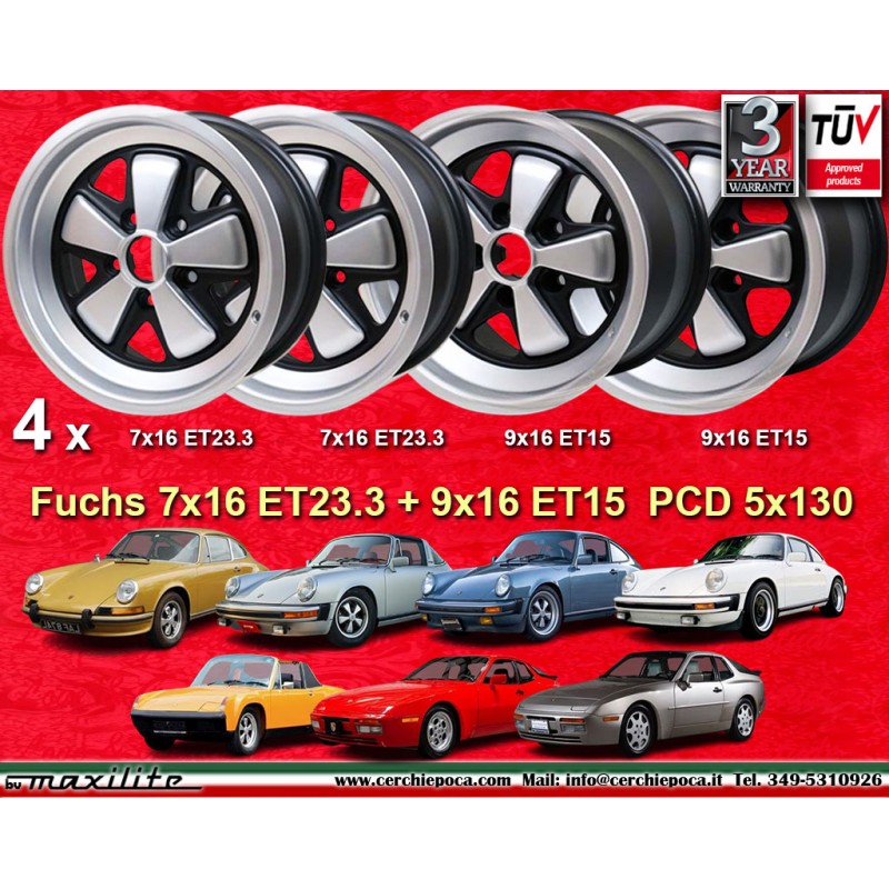 Design Fuchs finish: anodized look. Sizes: 2 wheels 7x16 offset ET23.3 weight Kg 7.3 + 2 wheels 9x16 offset ET15 weight Kg 8.3 with PCD 5x130 center bore: 71.6 mm. Suitable for: 911 -1989 914-6 944 -1986 turbo -1989 Produced by: Maxilite. Certificates of homologation: YES. Warranty 3 years by manufacturer. Possible return and refund for unused products without signs of use, in the original packaging, according to the terms of the law.