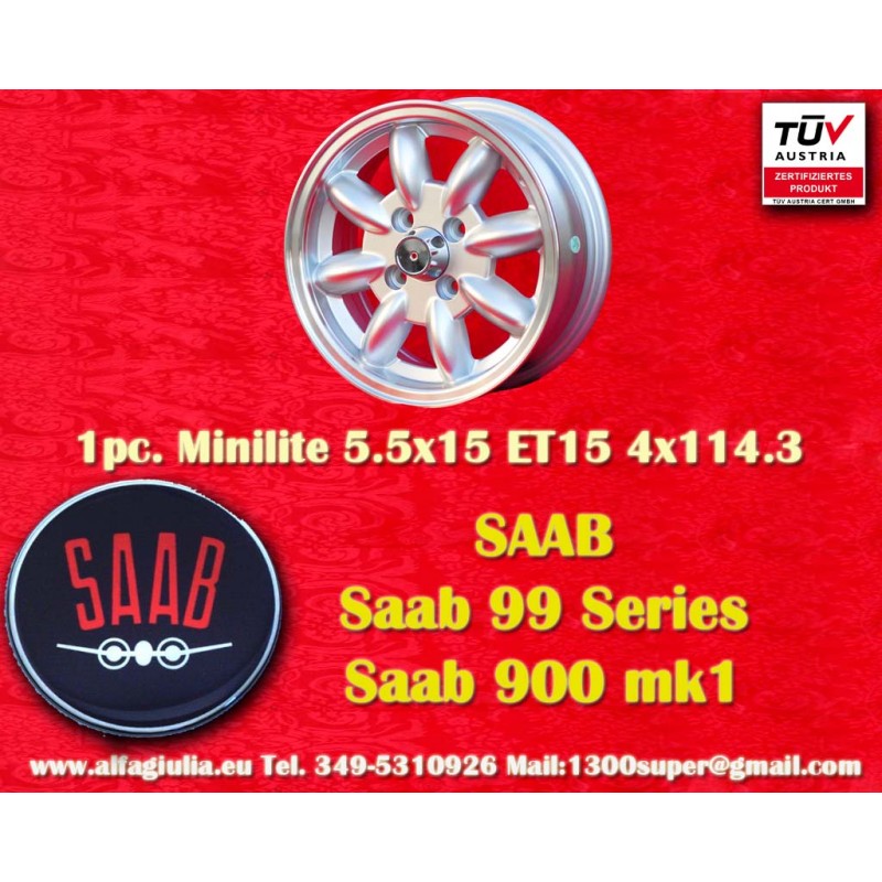 Design Minilite silver/diamond cut finish size 5.5x15 PCD 4x114.3 offset ET15 center bore 76.6 mm weight Kg 6.2. Producer: Maxilite. Warranty 3 years by manufacturer. Certificates of homologation: TUV. Possible return and refund for unused products without signs of use, in the original packaging, according to the terms of the law.