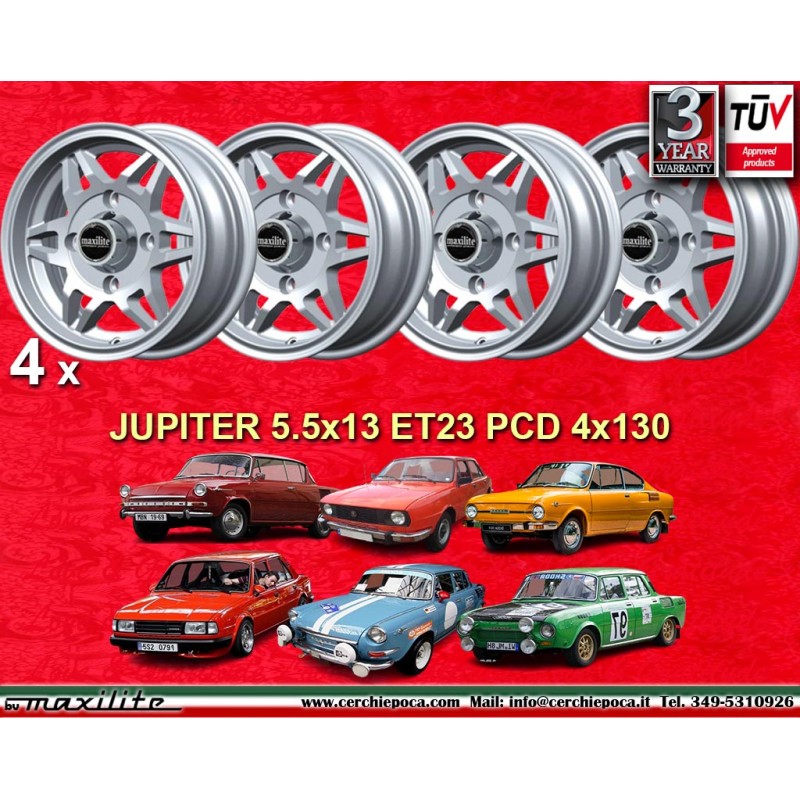 Design Jupiter silver finish size 5.5x13 PCD 4x130 offset ET23 center bore 90.1 mm weight Kg 5.5. Producer: Maxilite. Warranty 3 years by manufacturer. Certificates of homologation: TUV. Possible return and refund for unused products without signs of use, in the original packaging, according to the terms of the law.