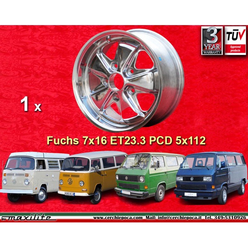Design Fuchs fully polished finish size 7x16 PCD 5x112 offset ET23.3 center bore 71.6 mm weight Kg 7.4. Producer: Maxilite. Warranty 3 years by manufacturer. Certificates of homologation: TUV. Possible return and refund for unused products without signs of use, in the original packaging, according to the terms of the law.