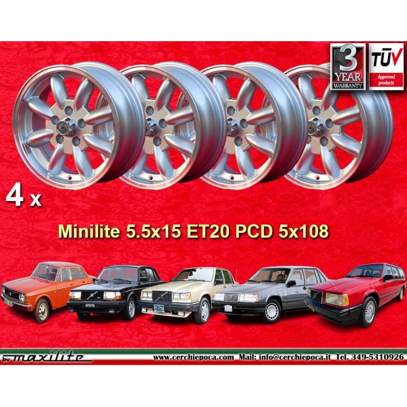 Design Minilite silver/diamond cut finish size 5.5x15 PCD 5x108 offset ET20 center bore 67.2 mm weight Kg 6.2. Producer: Maxilite. Warranty 3 years by manufacturer. Certificates of homologation: TUV. Possible return and refund for unused products without signs of use, in the original packaging, according to the terms of the law.