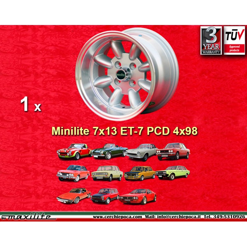 Diseno Minilite en acabado silver/diamond cut dimensiones 7x13 sistema de fijacion PCD 4x98 offset ET-7 diametro agujero central 58.6 mm llanta simple peso Kg 6.1. Fabricado por: Maxilite. Garantia 3 anos por fabricante. Certificados de homologacion: TUV. Posible devolucion y reembolso por productos no utilizados sin signos de uso, en el embalaje original, segun los terminos de la ley.