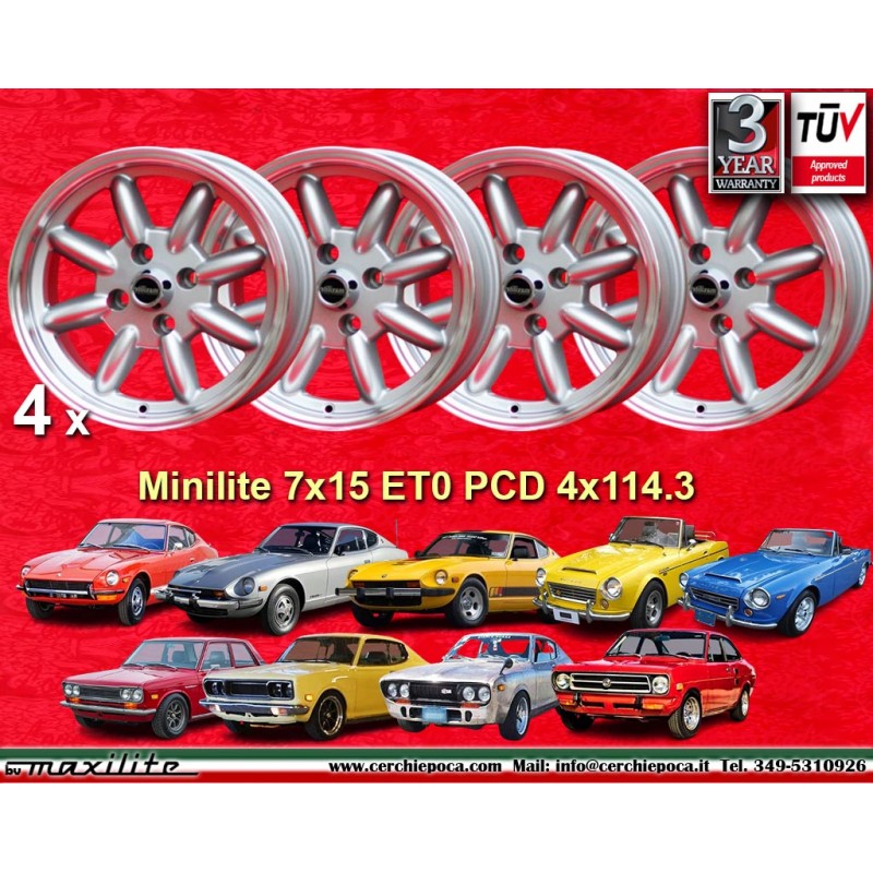 Diseno Minilite en acabado silver/diamond cut dimensiones 7x15 sistema de fijacion PCD 4x114.3 offset ET0 diametro agujero central 76.6 mm llanta simple peso Kg 6.7. Fabricado por: Maxilite. Garantia 3 anos por fabricante. Certificados de homologacion: TUV. Posible devolucion y reembolso por productos no utilizados sin signos de uso, en el embalaje original, segun los terminos de la ley.