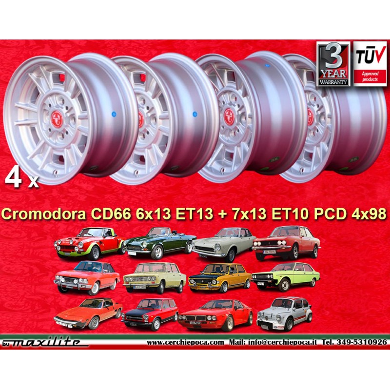 Diseno Cromodora CD66 en acabado silver. Dimensiones: 2 llantas 6x13 offset ET13 peso Kg 6.4 + 2 llantas 7x13 offset ET10 peso Kg 7.4 sistema de fijacion PCD 4x98 diametro agujero central 58.6 mm. Adecuado para los siguientes modelos: 124 Abarth Berlina Coupe Spider 125 127 128 131 X19 A112 Beta Montecarlo Fabricado por: Maxilite. Certificados de homologacion: YES. Garantia 3 anos por fabricante. Posible devolucion y reembolso por productos no utilizados sin signos de uso, en el embalaje original, segun los terminos de la ley.