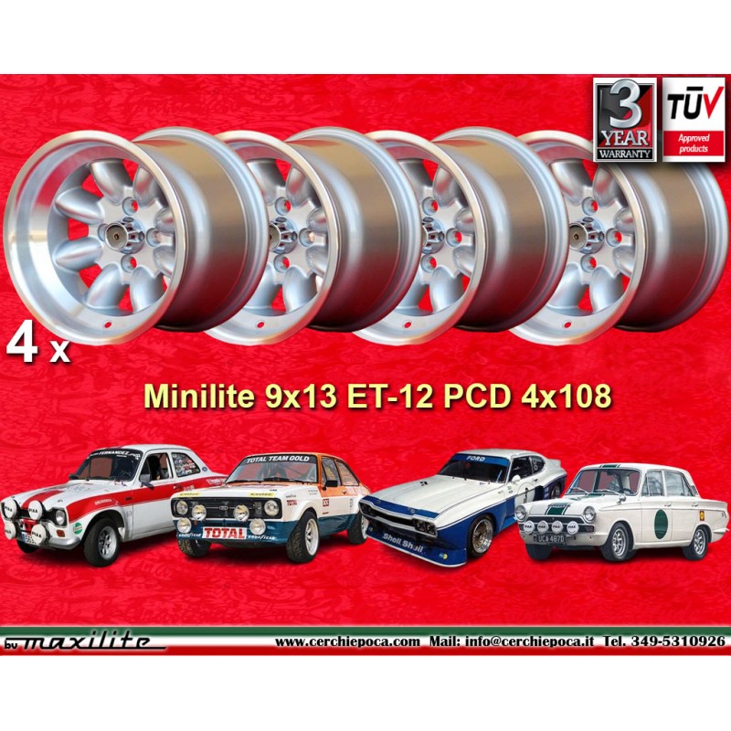 Diseno Minilite en acabado silver/diamond cut dimensiones 9x13 sistema de fijacion PCD 4x108 offset ET-12 diametro agujero central 63.4 mm llanta simple peso Kg 7.5. Fabricado por: Maxilite. Garantia 3 anos por fabricante. Certificados de homologacion: TUV. Posible devolucion y reembolso por productos no utilizados sin signos de uso, en el embalaje original, segun los terminos de la ley.