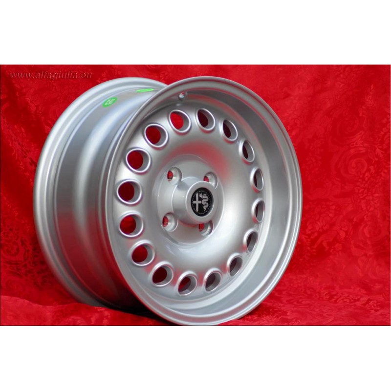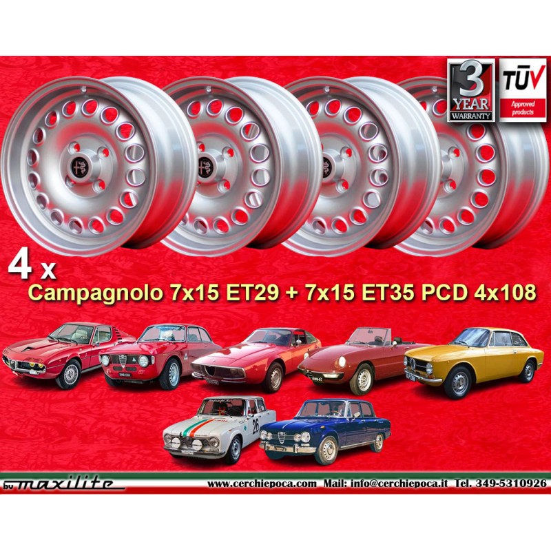 Design Campagnolo en finition silver. Dimensions: 2 jantes 7x15 deport ET29 poids Kg 7.4 + 2 jantes 7x15 deport ET35 poids Kg 7.4 systeme de fixation PCD 4x108 diametre du trou central 70.1 mm. Convient aux modeles suivants: GTA 105 Coupe Spider GT GTC Montreal Fabrique par: Maxilite. Certificats d'homologation: YES. Garantie 3 ans par fabricant. Retour et remboursement possible pour les produits non utilises sans traces d'utilisation, dans l'emballage d'origine, selon les termes de la loi.