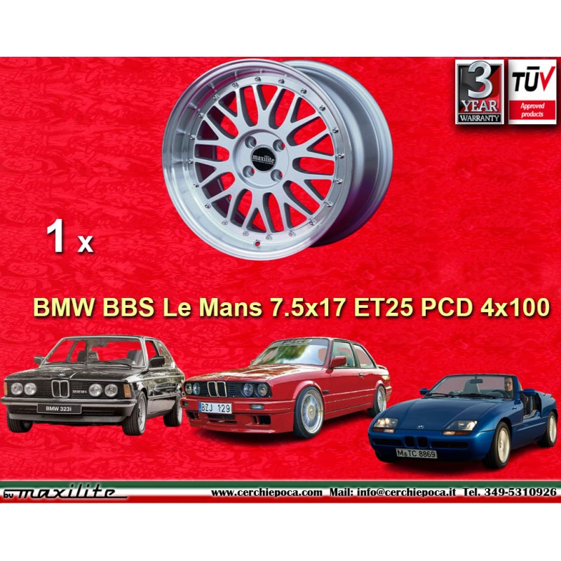 Design BBS Le Mans en finition silver/diamond cut lip dimensions 7.5x17 systeme de fixation PCD 4x100 deport ET25 diametre du trou central 57.1 mm poids de la jante simple Kg 10.5. Fabrique par: Maxilite. Garantie 3 ans par fabricant. Certificats d'homologation: TUV. Retour et remboursement possible pour les produits non utilises sans traces d'utilisation, dans l'emballage d'origine, selon les termes de la loi.