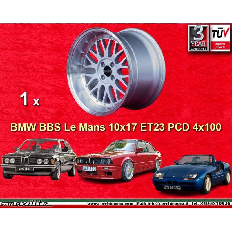 Design BBS Le Mans en finition silver/diamond cut lip dimensions 10x17 systeme de fixation PCD 4x100 deport ET23 diametre du trou central 57.1 mm poids de la jante simple Kg 11.9. Fabrique par: Maxilite. Garantie 3 ans par fabricant. Certificats d'homologation: TUV. Retour et remboursement possible pour les produits non utilises sans traces d'utilisation, dans l'emballage d'origine, selon les termes de la loi.