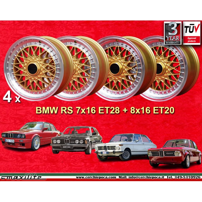 Design Super RS en finition gold. Dimensions: 2 jantes 7x16 deport ET28 poids Kg 8.4 + 2 jantes 8x16 deport ET20 poids Kg 8.7 systeme de fixation PCD 4x100 diametre du trou central 57.1 mm. Convient aux modeles suivants: E30 E21 3 serie Volkswagen Golf 1-3 Scirocco 1 2 Jetta 1 2 Vento Passat 35i Opel Kadett B C Ascona A B Manta GT Rekord C D Fabrique par: Maxilite. Certificats d'homologation: YES. Garantie 3 ans par fabricant. Retour et remboursement possible pour les produits non utilises sans traces d'utilisation, dans l'emballage d'origine, selon les termes de la loi.