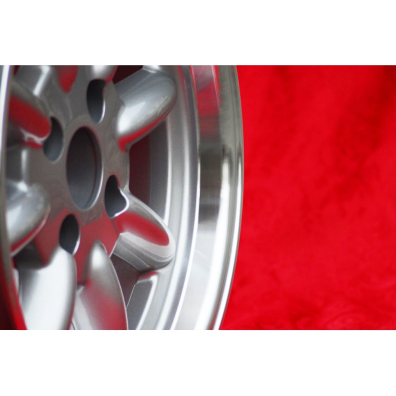 Design Minilite en finition silver/diamond cut. Dimensions: 2 jantes 7x15 deport ET5 poids Kg 6.7 + 2 jantes 8x15 deport ET-6 poids Kg 9 systeme de fixation PCD 4x100 diametre du trou central 57.1 mm. Convient aux modeles suivants: 1502-2002 1500-2000tii 2000C CA CS 3 E21 E30 Opel Kadett Manta Rekord Fabrique par: Maxilite. Certificats d'homologation: YES. Garantie 3 ans par fabricant. Retour et remboursement possible pour les produits non utilises sans traces d'utilisation, dans l'emballage d'origine, selon les termes de la loi.