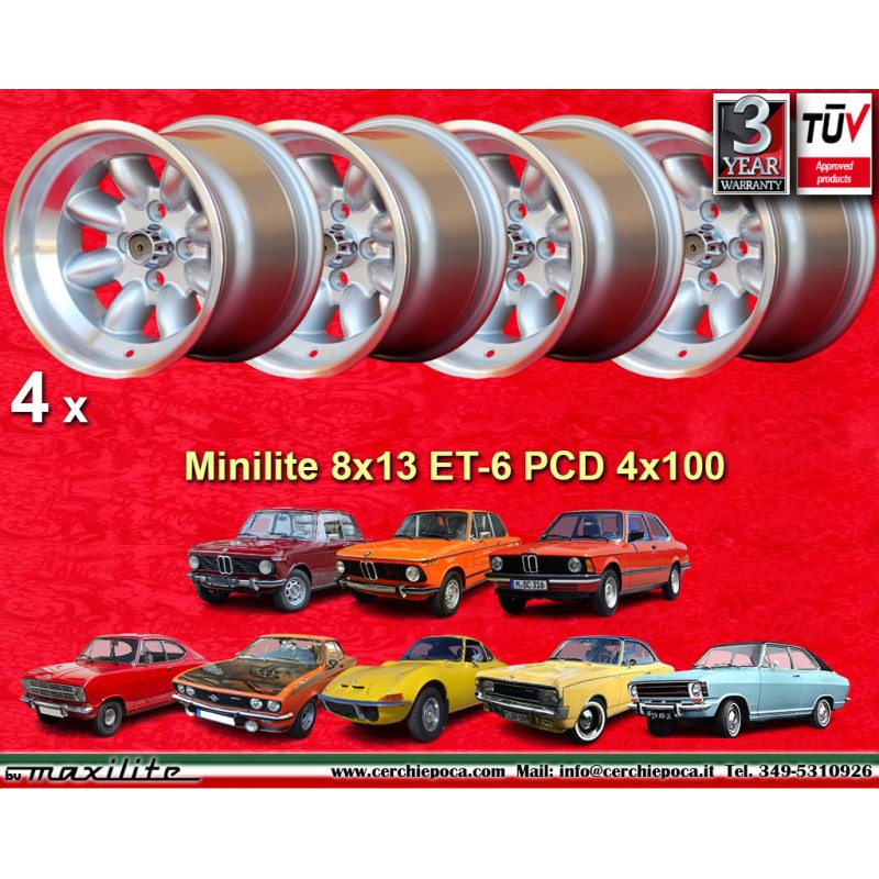 Design Minilite en finition silver/diamond cut dimensions 8x13 systeme de fixation PCD 4x100 deport ET-6 diametre du trou central 57.1 mm poids de la jante simple Kg 6.8. Fabrique par: Maxilite. Garantie 3 ans par fabricant. Certificats d'homologation: TUV. Retour et remboursement possible pour les produits non utilises sans traces d'utilisation, dans l'emballage d'origine, selon les termes de la loi.