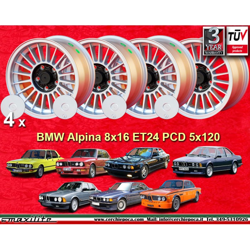 Design Alpina en finition silver/black dimensions 8x16 systeme de fixation PCD 5x120 deport ET24 diametre du trou central 72.6 mm poids de la jante simple Kg 9. Fabrique par: Maxilite. Garantie 3 ans par fabricant. Certificats d'homologation: TUV. Retour et remboursement possible pour les produits non utilises sans traces d'utilisation, dans l'emballage d'origine, selon les termes de la loi.