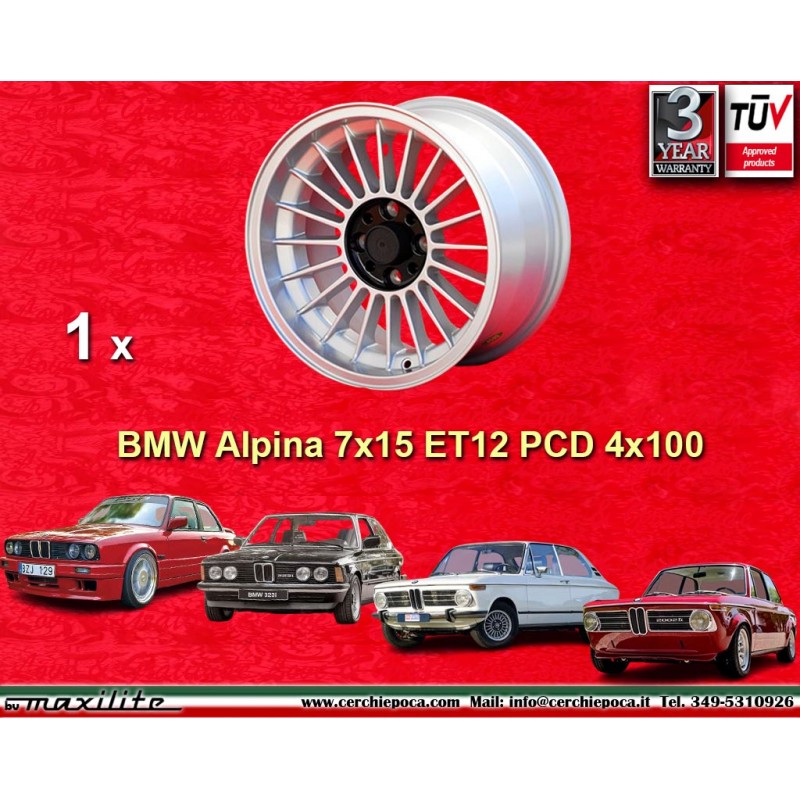 Design Alpina en finition silver/black dimensions 7x15 systeme de fixation PCD 4x100 deport ET12 diametre du trou central 57.1 mm poids de la jante simple Kg 6.8. Fabrique par: Maxilite. Garantie 3 ans par fabricant. Certificats d'homologation: TUV. Retour et remboursement possible pour les produits non utilises sans traces d'utilisation, dans l'emballage d'origine, selon les termes de la loi.