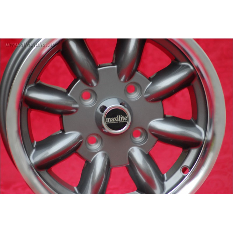 Design Minilite en finition anthracite/diamond cut dimensions 6x13 systeme de fixation PCD 4x108 deport ET16 diametre du trou central 63.4 mm poids de la jante simple Kg 5.3. Fabrique par: Maxilite. Garantie 3 ans par fabricant. Certificats d'homologation: TUV. Retour et remboursement possible pour les produits non utilises sans traces d'utilisation, dans l'emballage d'origine, selon les termes de la loi.