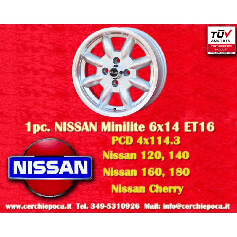 Design Minilite en finition silver/diamond cut dimensions 6x14 systeme de fixation PCD 4x114.3 deport ET22 diametre du trou central 76.6 mm poids de la jante simple Kg 6.2. Fabrique par: Maxilite. Garantie 3 ans par fabricant. Certificats d'homologation: TUV. Retour et remboursement possible pour les produits non utilises sans traces d'utilisation, dans l'emballage d'origine, selon les termes de la loi.