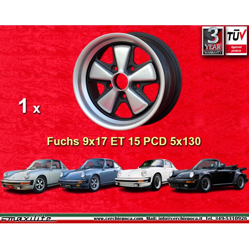 Design Fuchs en finition anodized look dimensions 9x17 systeme de fixation PCD 5x130 deport ET15 diametre du trou central 71.6 mm poids de la jante simple Kg 10.6. Fabrique par: Maxilite. Garantie 3 ans par fabricant. Certificats d'homologation: TUV. Retour et remboursement possible pour les produits non utilises sans traces d'utilisation, dans l'emballage d'origine, selon les termes de la loi.