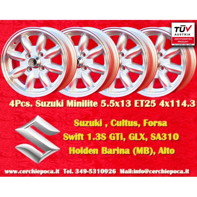 Design Minilite en finition silver/diamond cut dimensions 5.5x13 systeme de fixation PCD 4x114.3 deport ET25 diametre du trou central 76.1 mm poids de la jante simple Kg 4.8. Fabrique par: Maxilite. Garantie 3 ans par fabricant. Certificats d'homologation: TUV. Retour et remboursement possible pour les produits non utilises sans traces d'utilisation, dans l'emballage d'origine, selon les termes de la loi.