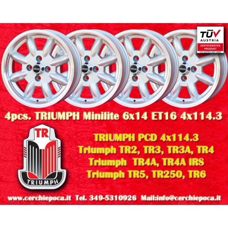 4 jantes Minilite 6x14 4x114.3 Triumph Saab MG MGB MGB Triumph TR2-TR6 Saab 99 Toyota Corolla Starlet Carina silver/dia