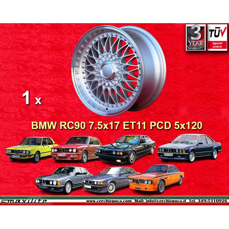 Design RC90 in finitura silver/diamond cut dimensioni 7.5x17 sistema di fissaggio PCD 5x120 offset ET11 diametro foro centrale 72.6 mm peso singolo cerchio Kg 10.5. Prodotto da: Maxilite. 3 anni di garanzia del produttore. Certificati di omologazione: TUV. Possibile restituzione e rimborso per prodotti non usati e senza segni di utilizzo, negli imballi originali, secondo i termini di legge.