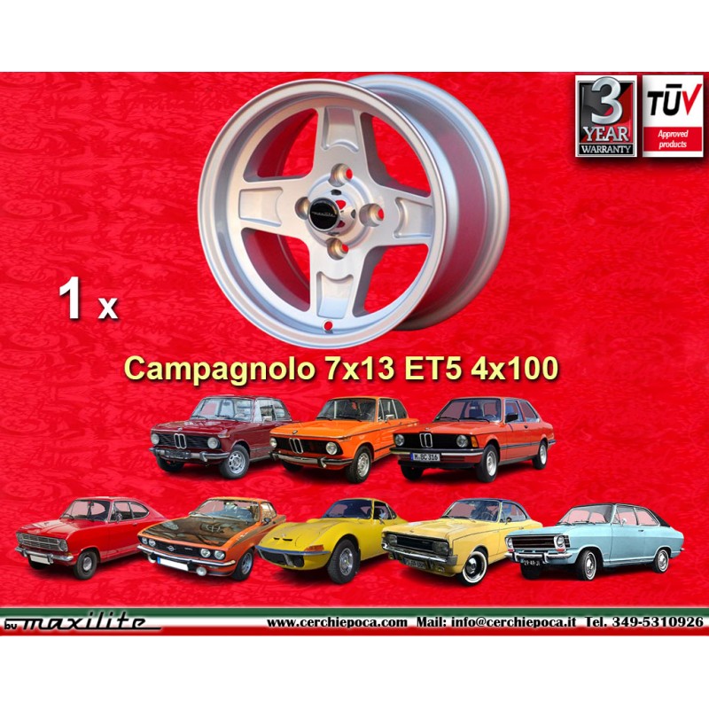 Design Campagnolo in finitura silver dimensioni 7x13 sistema di fissaggio PCD 4x100 offset ET5 diametro foro centrale 57.1 mm peso singolo cerchio Kg 5.3. Prodotto da: Maxilite. 3 anni di garanzia del produttore. Certificati di omologazione: TUV. Possibile restituzione e rimborso per prodotti non usati e senza segni di utilizzo, negli imballi originali, secondo i termini di legge.