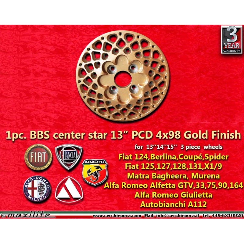Design BBS star in finitura gold dimensioni 13 sistema di fissaggio PCD 5x130 offset ETx diametro foro centrale 90.1 mm peso singolo cerchio Kg 2.8. Prodotto da: Maxilite. 3 anni di garanzia del produttore. Certificati di omologazione: TUV. Possibile restituzione e rimborso per prodotti non usati e senza segni di utilizzo, negli imballi originali, secondo i termini di legge.