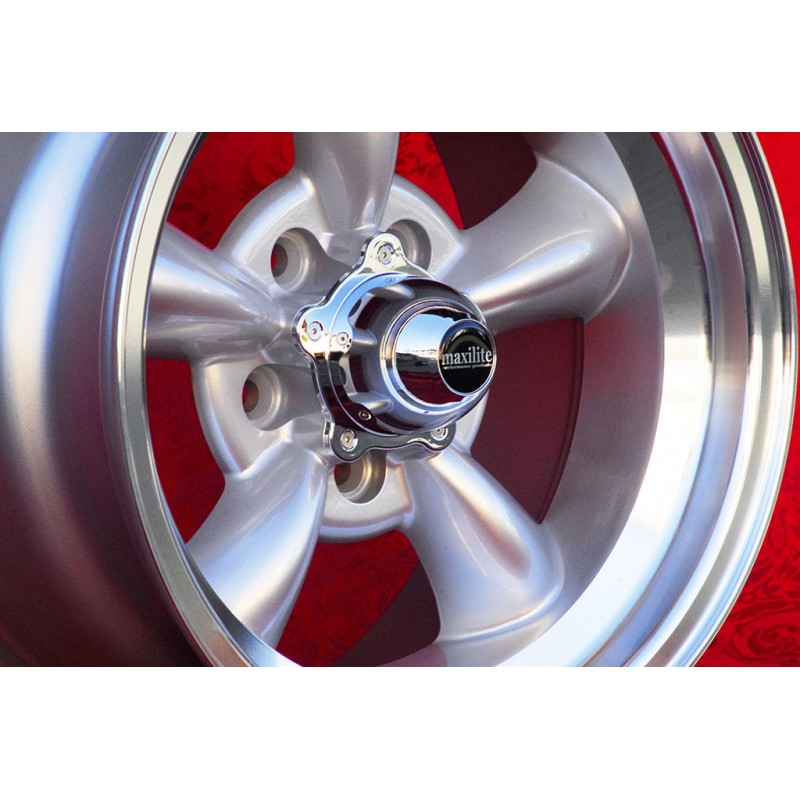 Design Torq Thrust in finitura silver/diamond cut dimensioni: 2 cerchi 7x15 offset ET-5 peso Kg 7.4 + 2 cerchi 8x15 offset ET0 peso Kg 8.1 sistema di fissaggio PCD 5x120.65 diametro foro centrale 83.1 mm. Per vetture: Camaro Nova Chevelle El Camino BelAir Caprice Impala Corvette Prodotti da: Maxilite. Certificati di omologazione: YES. 3 anni di garanzia del produttore. Possibile restituzione e rimborso per prodotti non usati e senza segni di utilizzo, negli imballi originali, secondo i termini di legge.