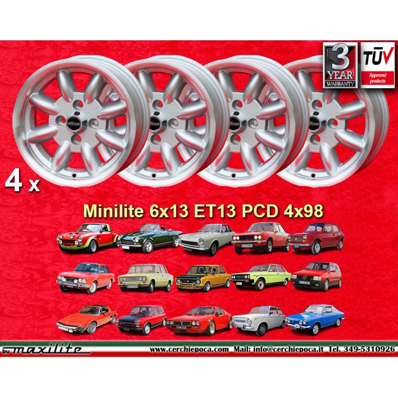 Design Minilite in finitura silver/diamond cut dimensioni 6x13 sistema di fissaggio PCD 4x98 offset ET13 diametro foro centrale 58.6 mm peso singolo cerchio Kg 5.3. Prodotto da: Maxilite. 3 anni di garanzia del produttore. Certificati di omologazione: TUV. Possibile restituzione e rimborso per prodotti non usati e senza segni di utilizzo, negli imballi originali, secondo i termini di legge.