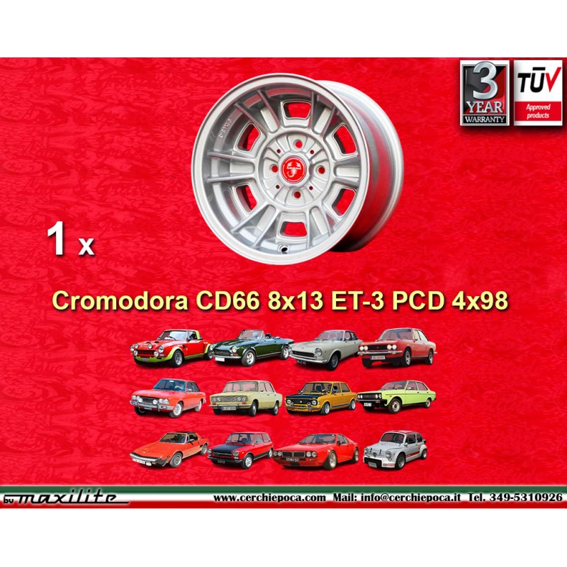 Design Cromodora CD66 in finitura silver dimensioni 8x13 sistema di fissaggio PCD 4x98 offset ET-3 diametro foro centrale 58.6 mm peso singolo cerchio Kg 7.8. Prodotto da: Maxilite. 3 anni di garanzia del produttore. Certificati di omologazione: TUV. Possibile restituzione e rimborso per prodotti non usati e senza segni di utilizzo, negli imballi originali, secondo i termini di legge.