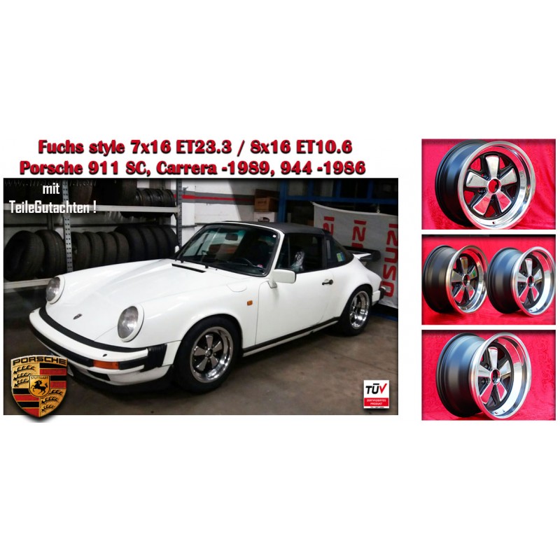 Design Fuchs in finitura RSR style dimensioni: 2 cerchi 7x16 offset ET23.3 peso Kg 7.3 + 2 cerchi 8x16 offset ET10.6 peso Kg 7.8 sistema di fissaggio PCD 5x130 diametro foro centrale 71.6 mm. Per vetture: 911 -1989 914-6 944 -1986 turbo -1989 Prodotti da: Maxilite. Certificati di omologazione: YES. 3 anni di garanzia del produttore. Possibile restituzione e rimborso per prodotti non usati e senza segni di utilizzo, negli imballi originali, secondo i termini di legge.